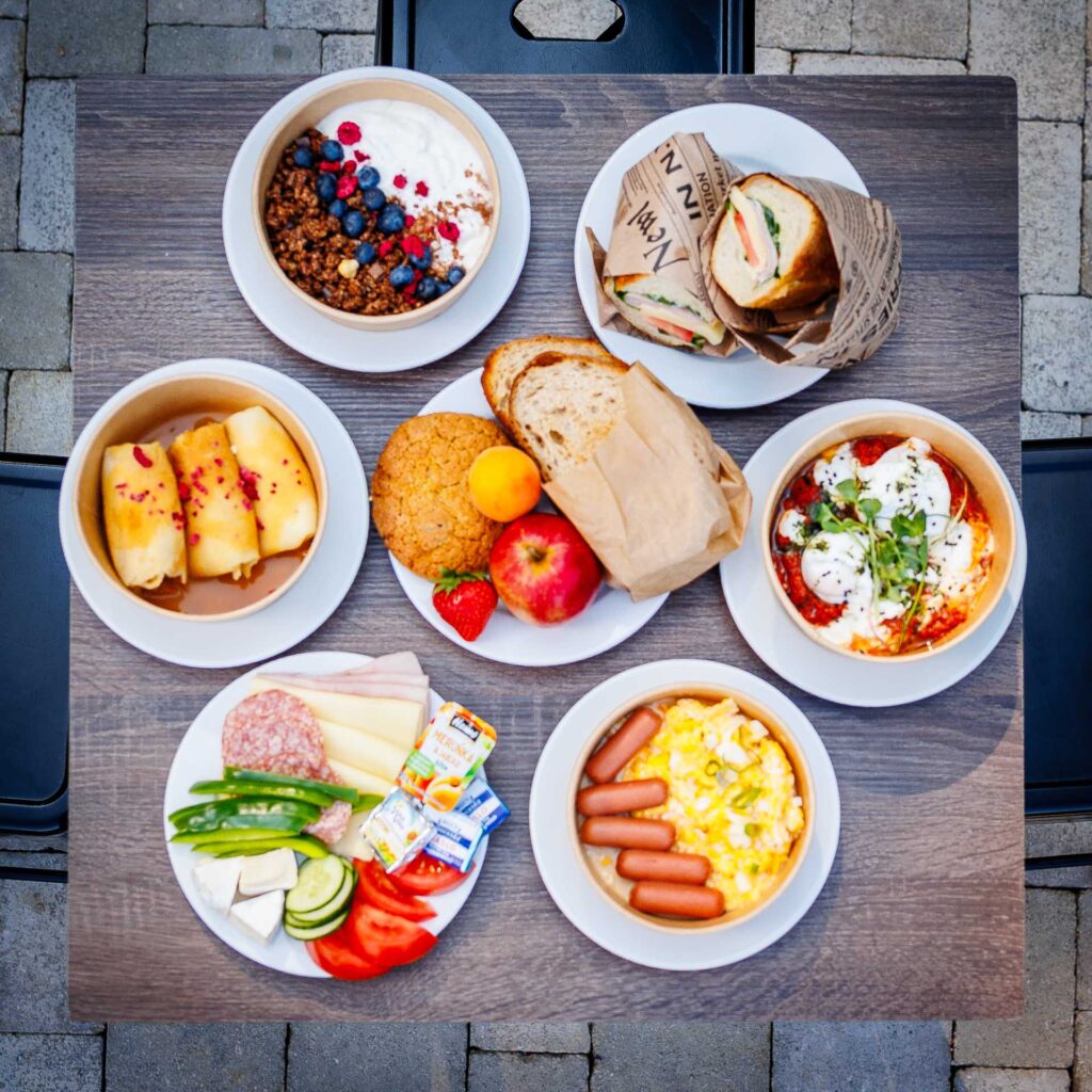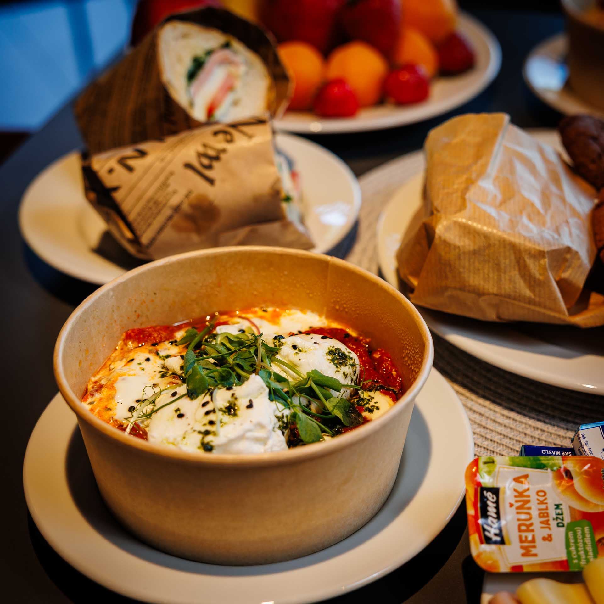 Ranný servis začína skôr, ako hosť otvorí dvere. Objednáte si deň vopred — cez recepciu alebo priamo pri príchode. Ráno pinesieme pred dverami objektu. Pripravený, teplý, načas.