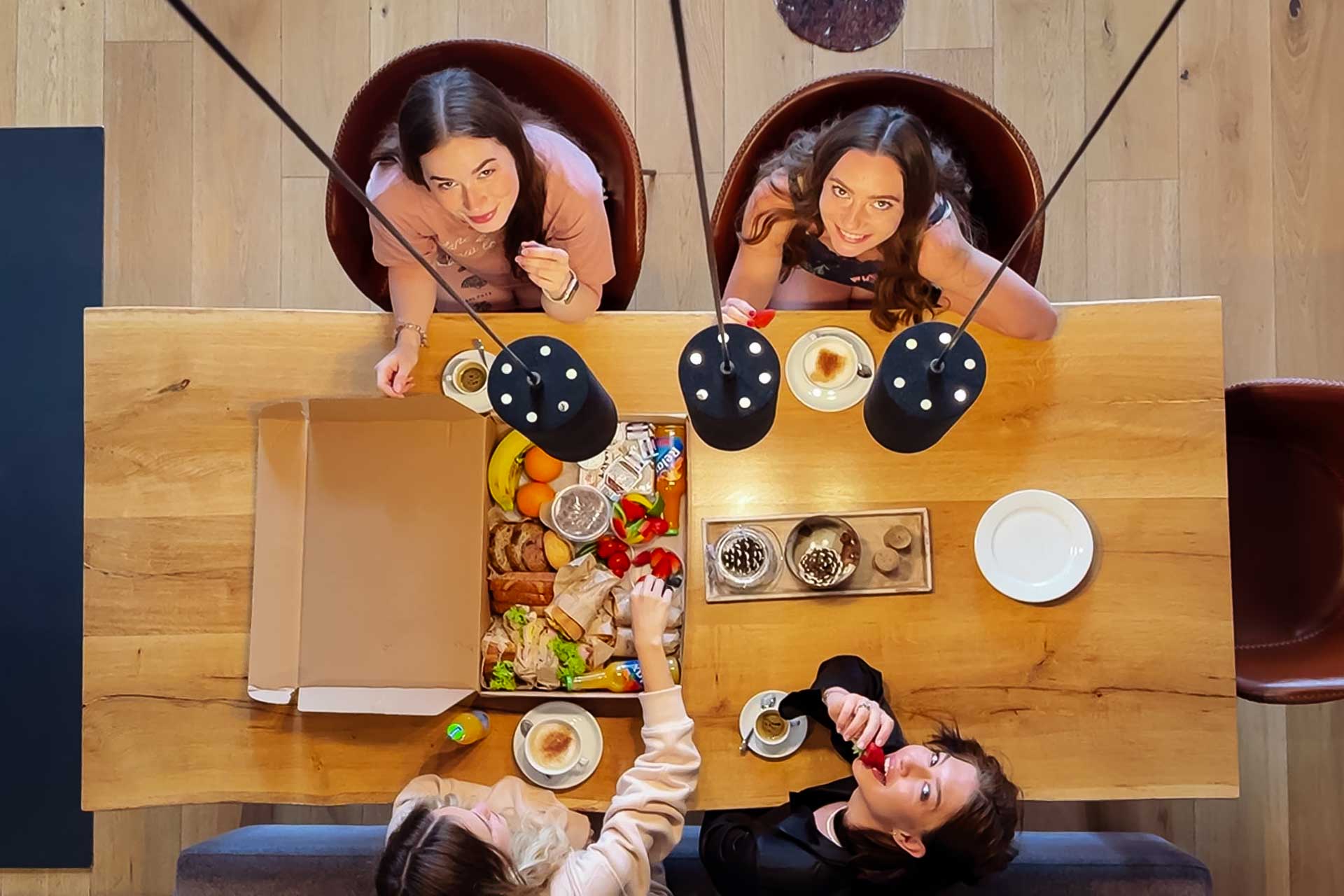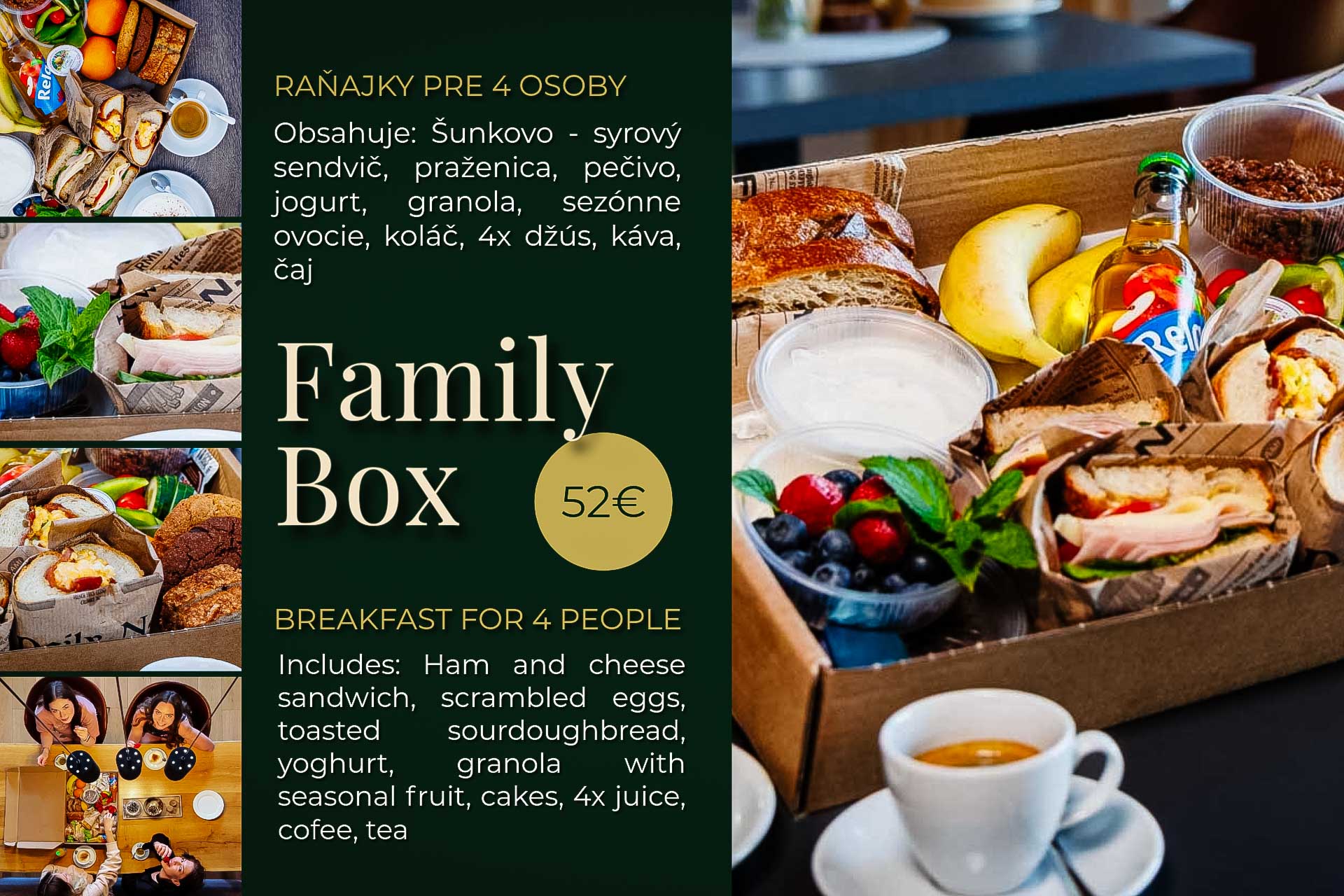 V ponuke sú jednotlivé raňajky podľa aktuálneho lístka aj Family box — štyri jedlá v jednom balení, navrhnutý pre skupiny do 4 osôb. Pre tých, čo si nevedia vybrať len jedno. Alebo pre tých, čo nechcú vyberať vôbec.